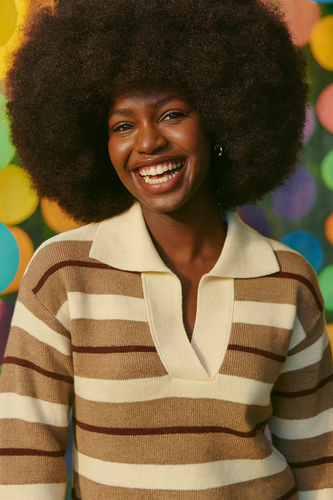 Cashmere Mix Oatmeal/ Brown Stripe High Neck Jumper