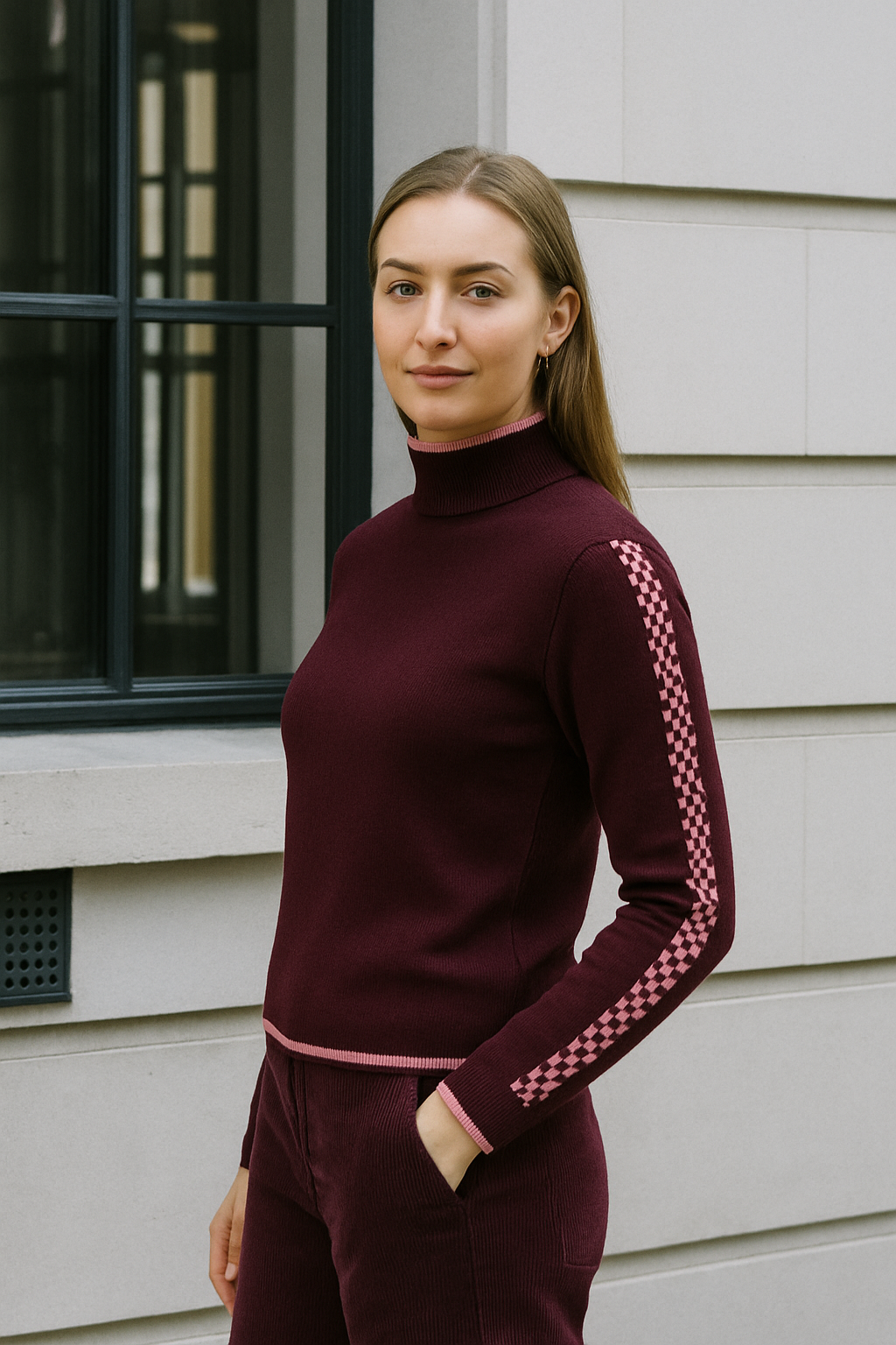 Super soft and stylish burgundy jumper has a check pattern in a light pink down each sleeve and just a little pink around the cuff and neck. Burgundy andPink is such a great combination you will stun in this jumper