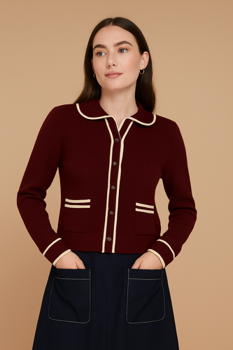 Cashmere Mix Cardigan with Collar Burgundy / Cream