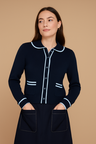 Cashmere Mix Cardigan with Collar Navy / Light blue