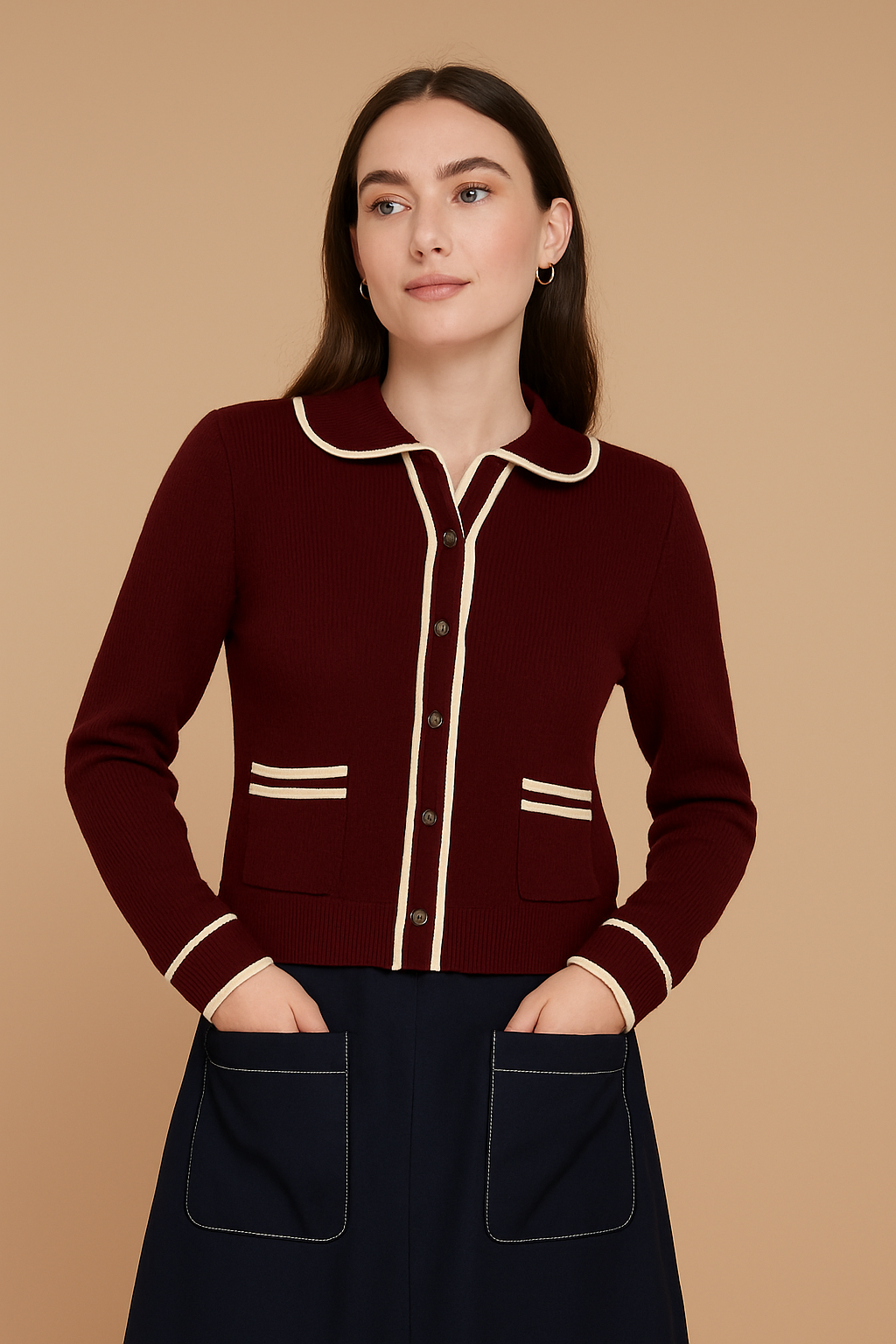 Super soft and stylish Burgundy cardigan with a cream trim and mother of peal buttons. This cardigan can be worn with jeans or over a dress